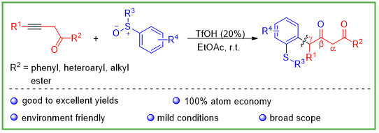 管西栋博士与中国医学科公司药物研究所卢诗超副研究员合作,基于直接区域选择性活化策略,利用β-炔基取代的羰基化合物(酮或酯)在酸催化下可原位异构化为累积二烯的特性,通过亚砜类亲核试剂的区域选择性的加成和后续σ迁移重排,实现了羰基γ位选择性芳基化,进而建立了合成1,3-二羰基化合物的新方法。该方法具有良好的底物普适性、完全的区域选择性、100%的原子经济性、条件温和、反应高效等特点。此外,新方法还成功应用于抗锥虫药非昔硝唑和非甾体抗炎药舒林酸的后期衍生化,极大地促进了该类分子的药理学研究。