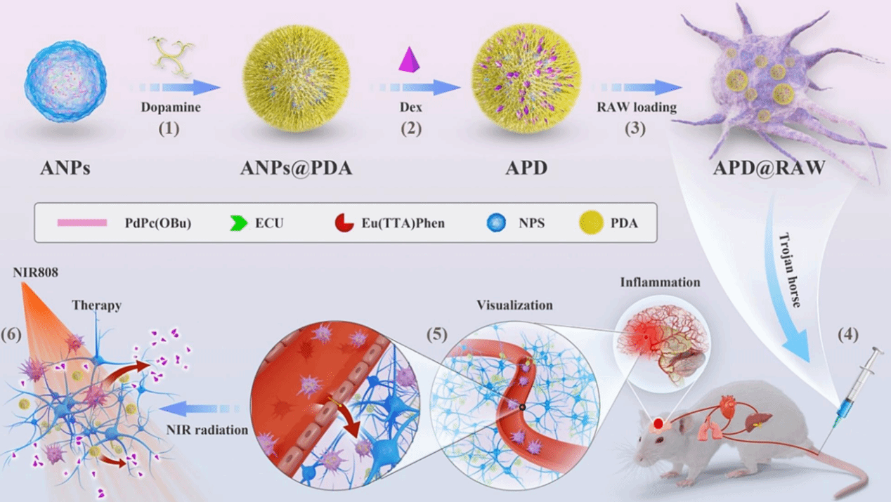 作为血流和脑细胞之间的“墙”,血脑屏障(BBB)对维持大脑稳态至关重要。然而,在药物传递中,治疗脑部疾病的药物很难通过血脑屏障,这给治疗中枢神经系统炎症性疾病带来了困难。为了实现有效、准确的药物递送和实时急性炎症体内观察,该团队研究人员报告了一种先进的纳米药物递送系统,该系统可以穿过BBB并靶向急性炎症,控制巨噬细胞伪装的发光纳米颗粒的响应,通过脑实质中的光热转化触发抗炎药物的释放,表现出良好的急性炎症识别和愈合能力。