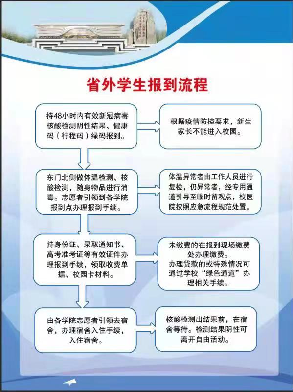 *省外新生须持48小时内有效新冠病毒核酸检测阴性结果(尽量携带纸质版)、健康码(行程码)绿码返校