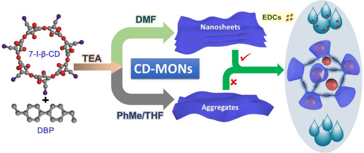 吸附法是去除环境污染物最有效的方法之一,而高效吸附剂的研制是关键。微孔有机网络(MON)属于新型多孔骨架材料,具有拓扑结构多样、比表面积大、稳定性高、易于功能化及可设计等优点,是很有潜力的环境污染物吸附剂。已报道的MONs多为零维(0D)、1D、3D或不规则的聚集形貌,而2D纳米片具有比表面积大及活性位点丰富的优点,有望大大提升MONs对环境污染物的去除效果,但相关研究较少,且文献报道的2D MONs多以模板法合成,步骤繁琐。为此,该团队创建了单体诱导无模板制备MONs纳米片新方法,以具有平面模板作用的七(6-碘-6-去氧)-β-环糊精为导向单体,与线性平面单体偶联制备了多种2D CD-MONs纳米片,实现了环境水样中双酚AF的高效去除,并揭示了2D MONs纳米片形貌对吸附性能的影响。该工作为制备MONs纳米片提供了一种新方法,拓展了MONs纳米片在环境污染物吸附和去除中的应用。