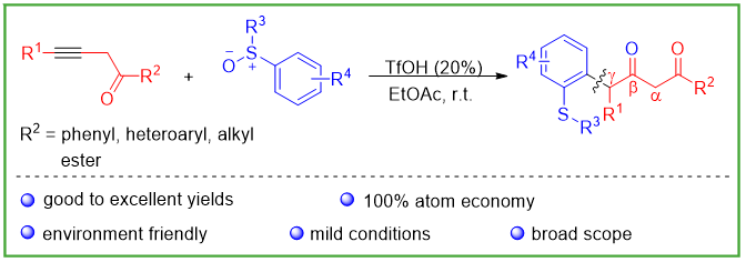 管西栋博士与中国医学科公司药物研究所卢诗超副研究员合作,基于直接区域选择性活化策略,利用β-炔基取代的羰基化合物(酮或酯)在酸催化下可原位异构化为累积二烯的特性,通过亚砜类亲核试剂的区域选择性的加成和后续σ迁移重排,实现了羰基γ位选择性芳基化,进而建立了合成1,3-二羰基化合物的新方法。该方法具有良好的底物普适性、完全的区域选择性、100%的原子经济性、条件温和、反应高效等特点。此外,新方法还成功应用于抗锥虫药非昔硝唑和非甾体抗炎药舒林酸的后期衍生化,极大地促进了该类分子的药理学研究。