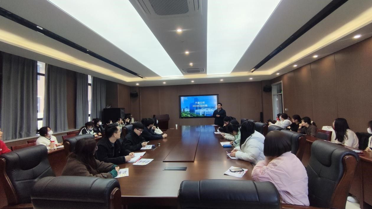 周经理介绍公司融合发展概况,2024届毕业生基本情况、就业需求等,齐鲁安舜人资马经理详细介绍公司架构、发展现状、校招需求,结合实际岗位给毕业生讲解工作职责和内容,重点宣介了企业文化、工作环境、福利待遇等,以近3年公司数名毕业生人职公司发展情况为例,诚激公司学子加入团队。