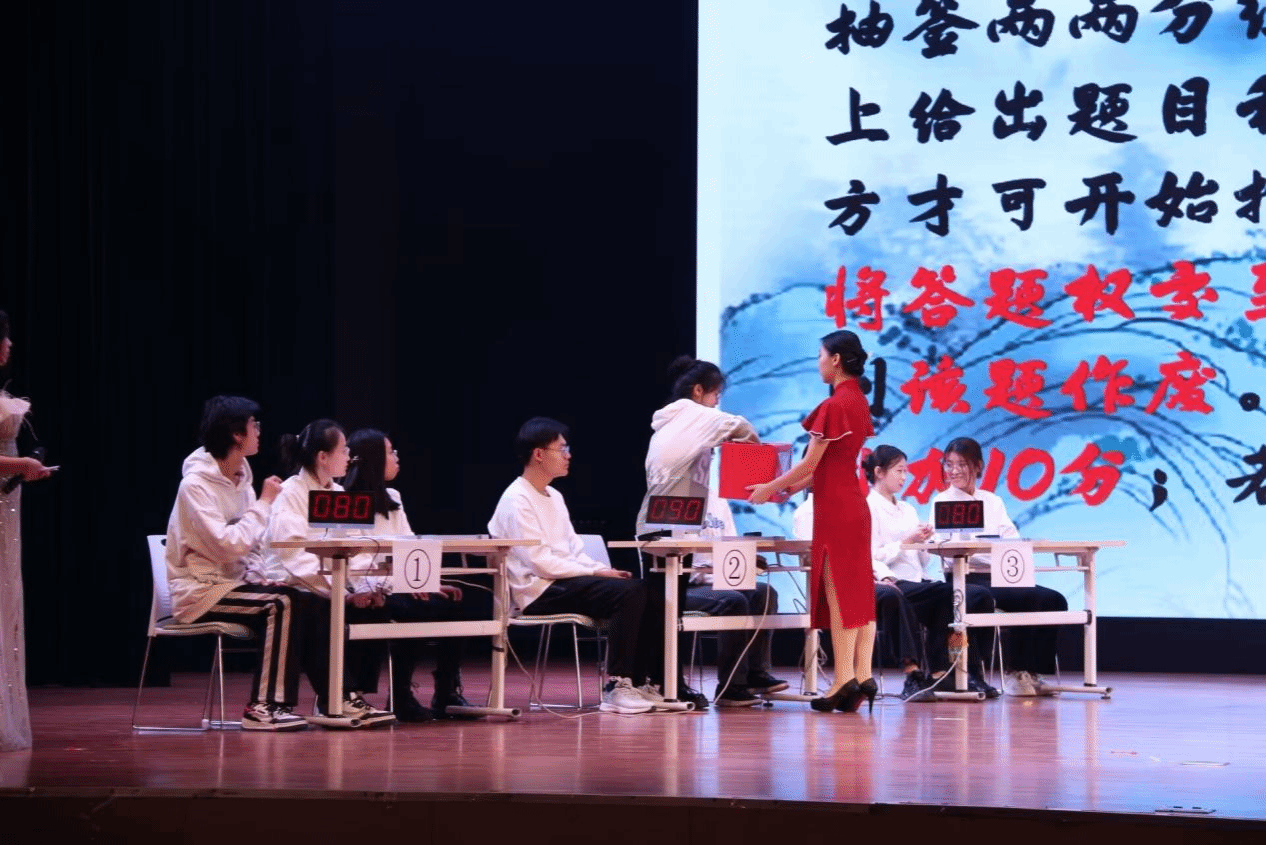 在必答题“潜龙在渊”环节,题目犀利简明,对选手们的知识储备功底进行深入考察,各队成员丝毫不惧,沉着应答,切要精准,势均力敌。紧随其后的抢答环节“千峰竞上”以擂台赛的形式展开,正式拉开团队间激烈角逐的序幕,擂台之上锋芒毕露,剑拔弩张,紧张的气氛弥漫场中,赛场“火药味”十足,抢答器响声此起彼伏,选手们沉着应对,各显其能,既比“手速”,也拼“脑速”,选手们的优秀表现将现场氛围逐渐推向高潮,赢得在场观众阵阵欢呼。