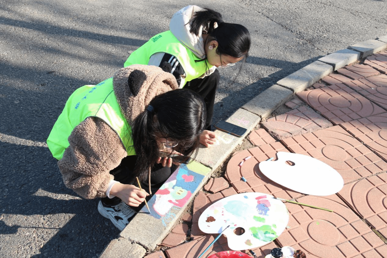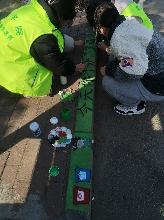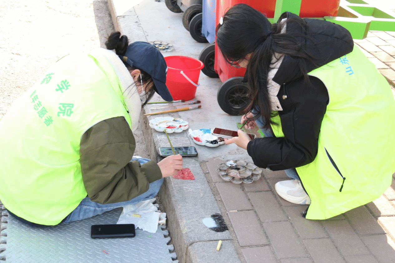 活动围绕“学习二十大,志愿建功行”的主旨,志愿者们以“绿色环保”、“交通安全”、“运动与健康”、“关爱野生动物”等为主题,采用涂鸦形式对长城路校区的路沿石、垃圾桶进行彩绘。勾线、渲染、描绘,一幅幅生动的画作体现着人文关怀;凝思、打稿、运笔,用一句句标语强烈感召着人心,志愿者们创新志愿形式,用热忱与汗水装点着校园春色,让“雷锋精神”在青春活力中不断传承。