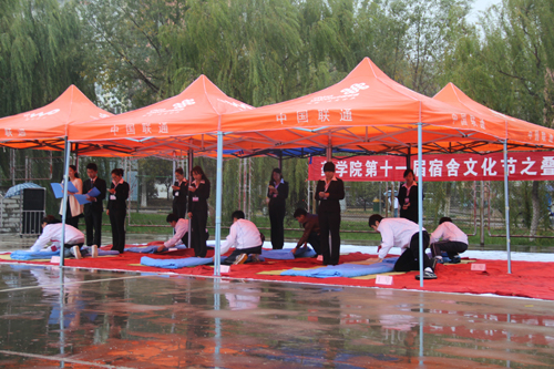 参赛人员共分为十二组,每组六人,每位参赛选手有150秒的叠被时间。在激情四射的开场舞之后,比赛正式拉开了帷幕。首先各参赛班级派出一男一女双人组进行了绑腿跑加时赛,他们的表现将为本班参赛同学赢得了额外的叠被时间。